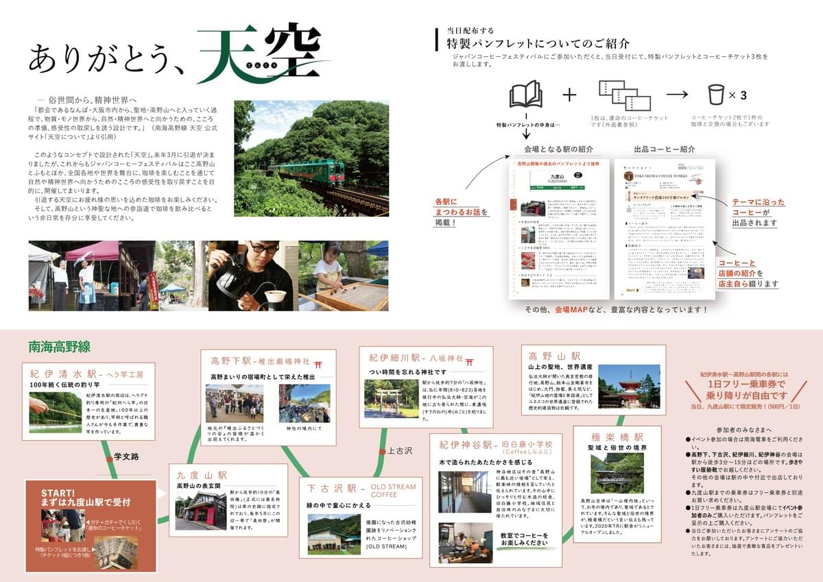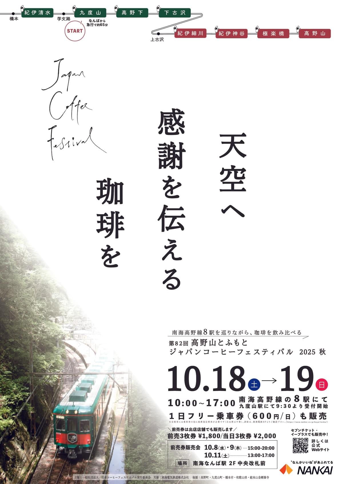 - 当イベント参加者のみ、南海高野線 紀伊清水駅〜高野山駅間の1日フリー乗車券をご購入いただけます。パンフレットをご呈示の上、ご購入ください。なお、天空乗車には乗車券の他に、座席指定席券が必要です(自由席は不要)。詳細は、南海電鉄HPよりご確認下さい。https://www.nankai.co.jp/koya/tenku/